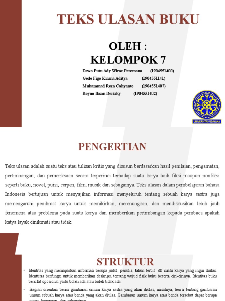 Penilaian dilakukan dari segi kelengkapan karya, penggunaan bahasanya serta memperhatikan sistematika resensi seperti yang telah dipaparkan di atas. Pada bagian ini penulis akan menyebutkan bagian yang bernilai atau kelebihan dari karya tersebut merekontruksi teks ulasan buku maksudnya adalah menuliskan kembali teks ulasan yang telah ada. • melatih penulis untuk bersikap kritis, tajam, jujur, objektif dan juga cendikia dalam menulis resensi. Semoga dapat bermanfaat dan memberikan pengetahuan bagi yang membaca. Teks ulasan yang bagus dan baik harus disusun berdasarkan struktur teks dan menggunakan kaidah kebahasaan, termasuk kaidah ejaan.